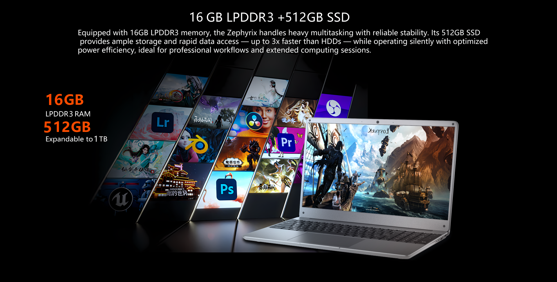 Equipped with 16GB LPDDR3 memory, the Zephyrix handles heavy multitasking with reliable stability. Its 512GB SSD provides ample storage and rapid data access — up to 3x faster than HDDs — while operating silently with optimized power efficiency, ideal for professional workflows and extended computing sessions.