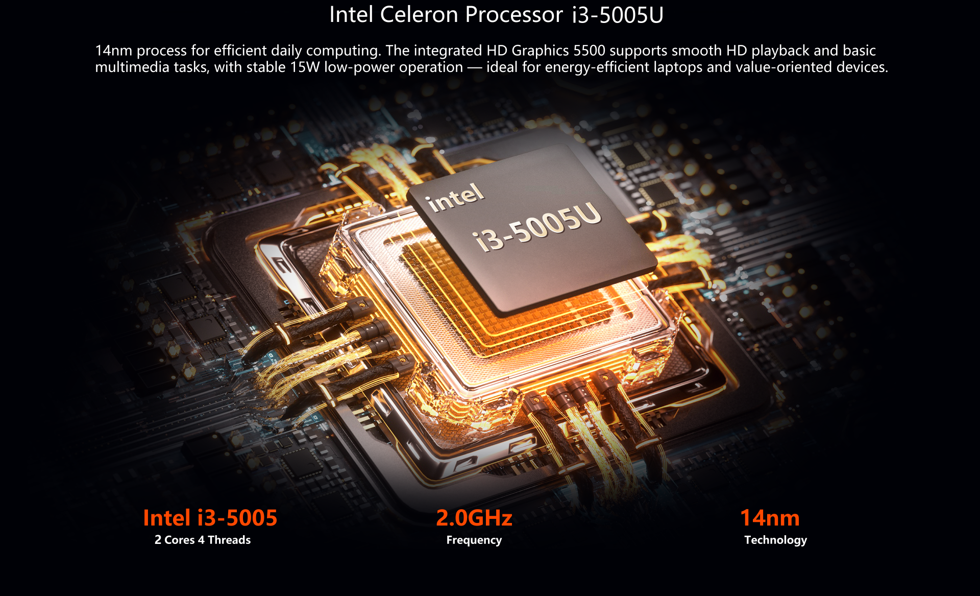 14nm process for efficient daily computing. The integrated HD Graphics 5500 supports smooth HD playback and basic multimedia tasks, with stable 15W low-power operation — ideal for energy-efficient laptops and value-oriented devices.